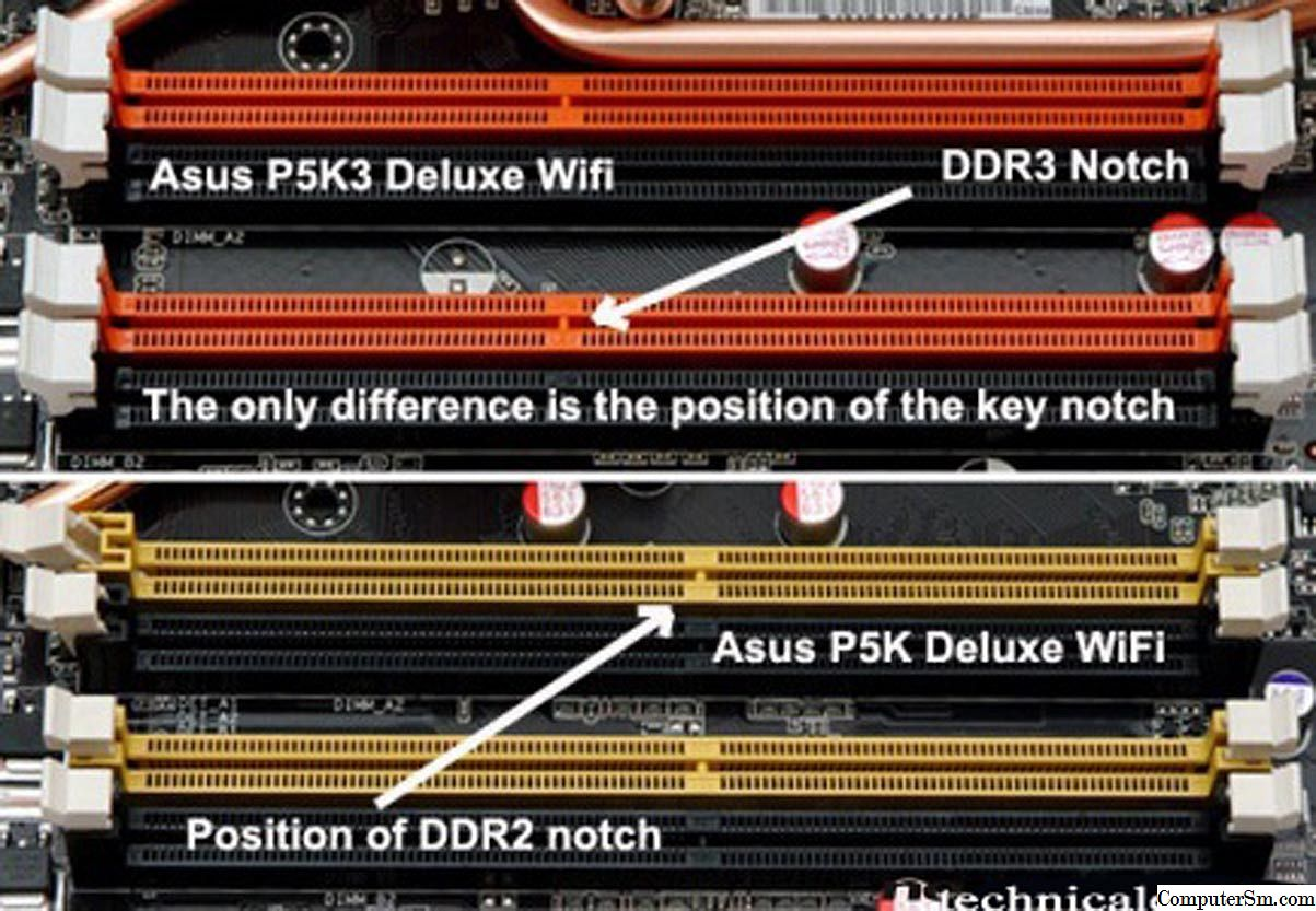 Slot pro RAM: Další komponent, který se umisťuje na základní desku je operační paměť. Na dnešních základních deskách jsou běžně 2 až 8 slotů, v závislosti například na formátu. Tyto sloty umožňují připojit vždy jednu konkrétní generaci operační paměti, protože generace nejsou zpětně kompatibilní. Liší se umístěním dělícího pruhu viz obrázek „Slot RAM na základní desce“