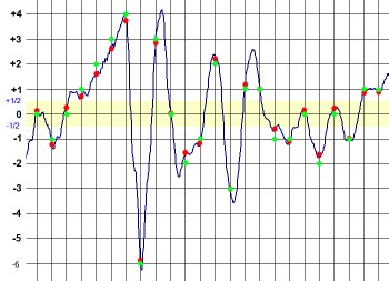 Zde můžeme vidět interval +- 0,5, Zelené body nám ukazují výslednou hodnotu při které se v digitalizaci pracuje