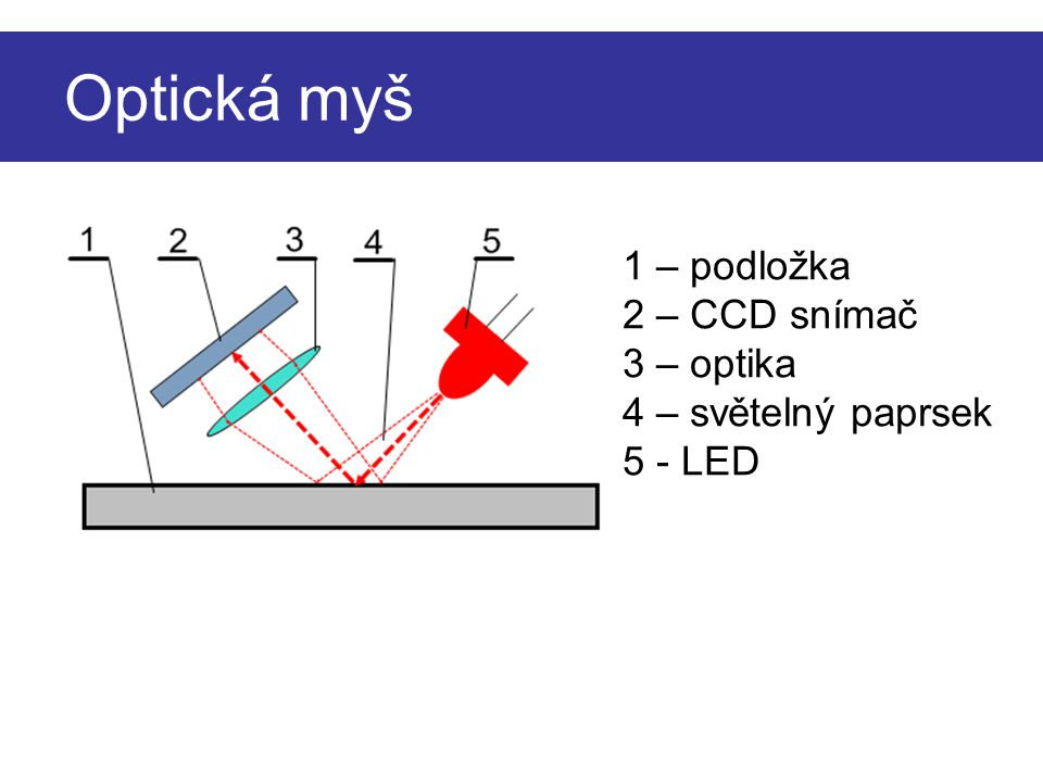 - Optická myš - optická myš používá světelný paprsek a snímač k detekci pohybu myši. Snímač zachytí obraz z povrchu, na kterém se myš pohybuje, a vypočítá, jak se myš pohybuje po povrchu. Tyto myši obvykle fungují nejlépe na hladkých a rovných površích.