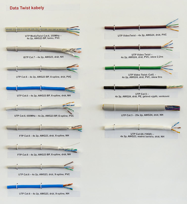 Rozlišujeme několik typů kroucené dvojlinky, UTP, FTP a další.