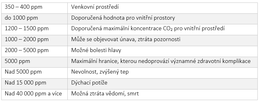 Oxid uhličitý (dále jen CO₂) je nezapáchající bezbarvý plyn bez chuti běžně se vyskytující v zemské atmosféře. Přirozená koncentrace částic CO₂ v přírodě se pohybuje v rozmezí 350 – 400 ppm. Doporučená úroveň pro vnitřní prostory je stanovena do 1000 ppm. Vydechnutý vzduch člověkem obsahuje průměrně 35 000 až 50 000 ppm. Konkrétní účinky koncentrací CO₂ na lidský organismus popisuje přiložená tabulka níže (Protronix, 2009).