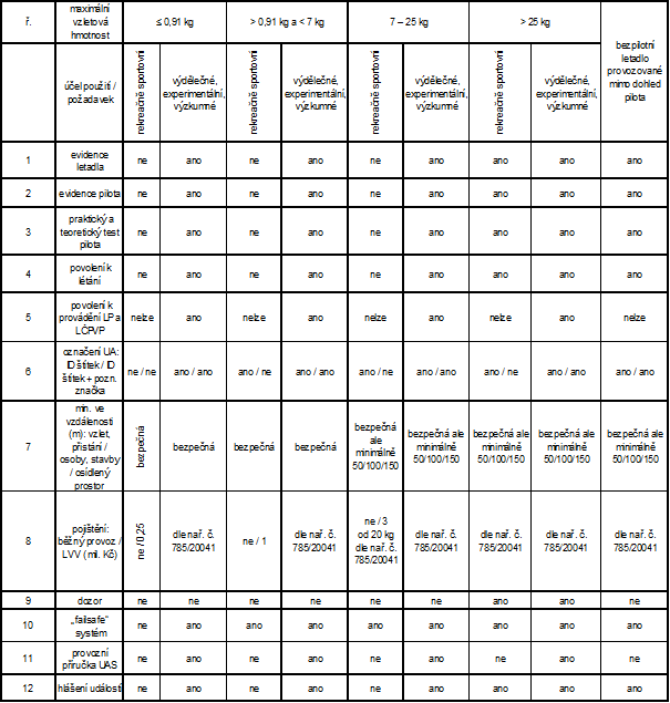 <0,91 Kg; 0,91 – 7 Kg; 7 – 20 Kg; >20 Kg. Od hmotnosti 0,91 Kg by měl být stroj opatřen identifikačním štítkem se jménem a telefonním číslem majitele, taktéž by měl mít systém umožňující v případě ztráty spojení bezpečně ukončí let tkz. Fail-safe. Dd hmotnosti 7 kg musí pilot dodržovat pravidlo, které se dobře pamatuje podle číslic 50, 100 a 150. Tedy, že při startu nikdo kromě pilota nesmí být blíže než 50 m, při letu se stroj nesmí k lidem a stavbám přiblížit na méně než 100 metrů a musí se létat nejméně 150 metrů od hustě zastavěných ploch (jde o horizontální vzdálenosti).